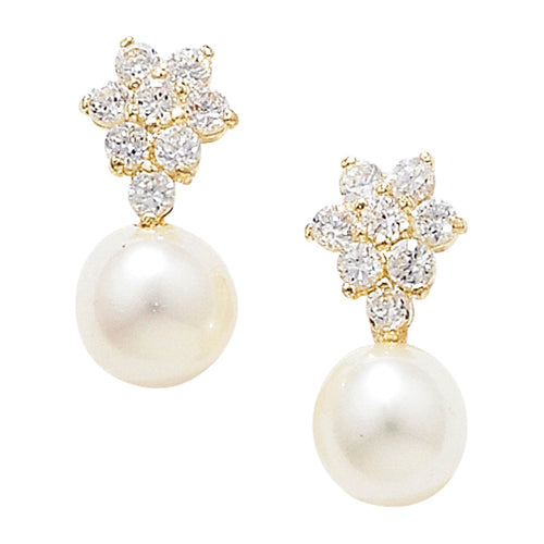 9ct Yellow Gold Synthetic Pearl & CZ Flower Cluster Mini Drop Earrings SKU 1507095