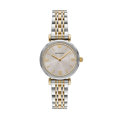 Ladies Armani Watch Stainless Steel Silver and Gold Tone Strap, Brown Stone Set dial, SKU 4005235