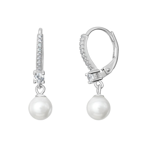 Sterling Silver CZ Hoop Synthetic Pearl Drop Earrings SKU 0110508